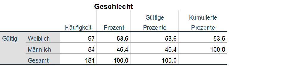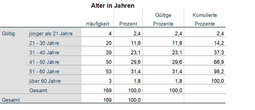 Die deskriptive Statistik beinhaltet noch die grafischen Auswertung der Fragen, sodass die obigen Auswertungen zusätzlich grafisch veranschaulicht werden.